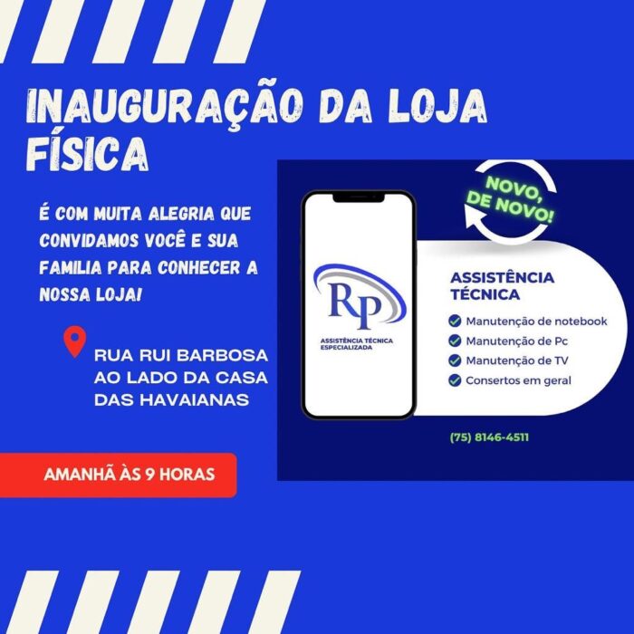 É neste sábado, grande inauguração da Loja RP Assistência Técnica Especializada. A loja ficará localizada na Rua Rui Barbosa, em Conceição da Feira.