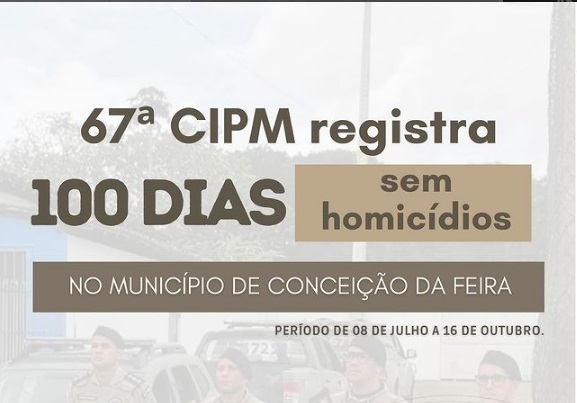 A 67ª registrou 100 dias sem Crimes Violentos Letais Intencionais (CVLI) na cidade de Conceição da Feira. Esse resultado positivo é reflexo das intensificações e operações realizadas, demonstrando o comprometimento da unidade com a segurança da nossa comunidade.