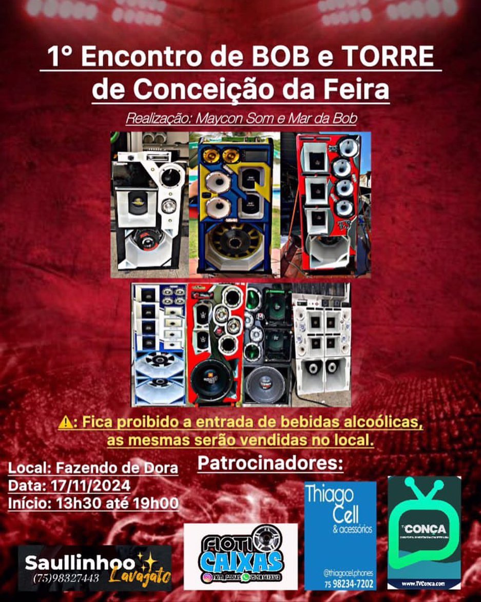 Acontecerá em Conceição da Feira, o 1º Encontro de Bob e Torre de Conceição da Feira. O evento acontecerá na Fazenda de Dora neste domingo, 17 de novembro, á partir das 13h30. A entrada de bebidas alcoólicas fica proibida, já que serão vendidas no local.