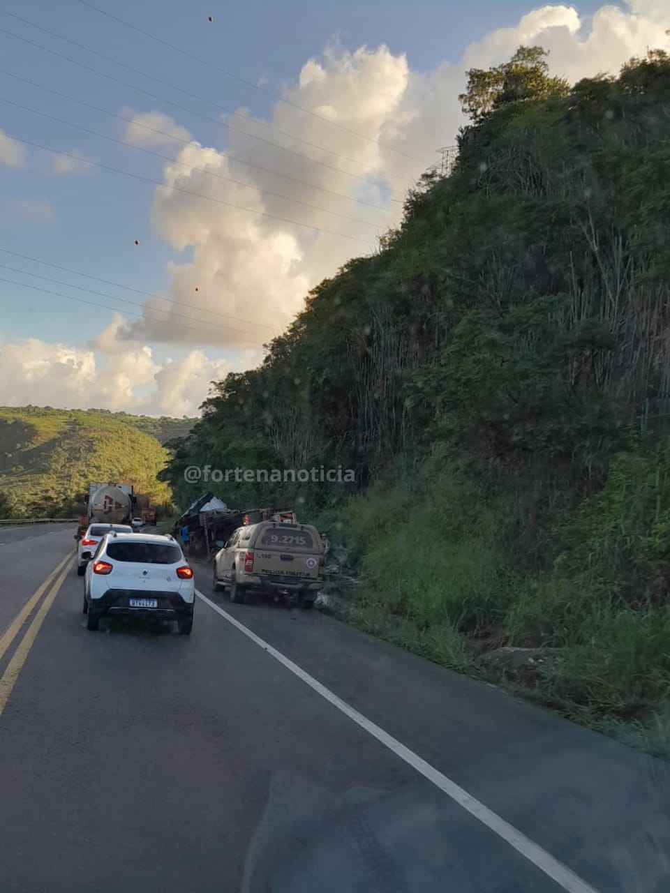 De acordo com informações enviadas por um leitor ao Forte na Notícia, o veículo de carga apresentou problemas nos freios antes de perder o controle e tombar na lateral da pista. O acidente provocou lentidão no trânsito da região durante a manhã.