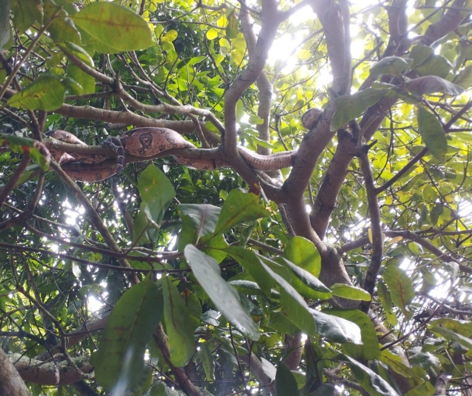 Uma cobra da espécie jiboia, medindo cerca de dois metros e meio, foi encontrada neste sábado (17/05) em uma árvore no Sítio Pinheiro, localizado em Conceição da Feira, interior da Bahia.
