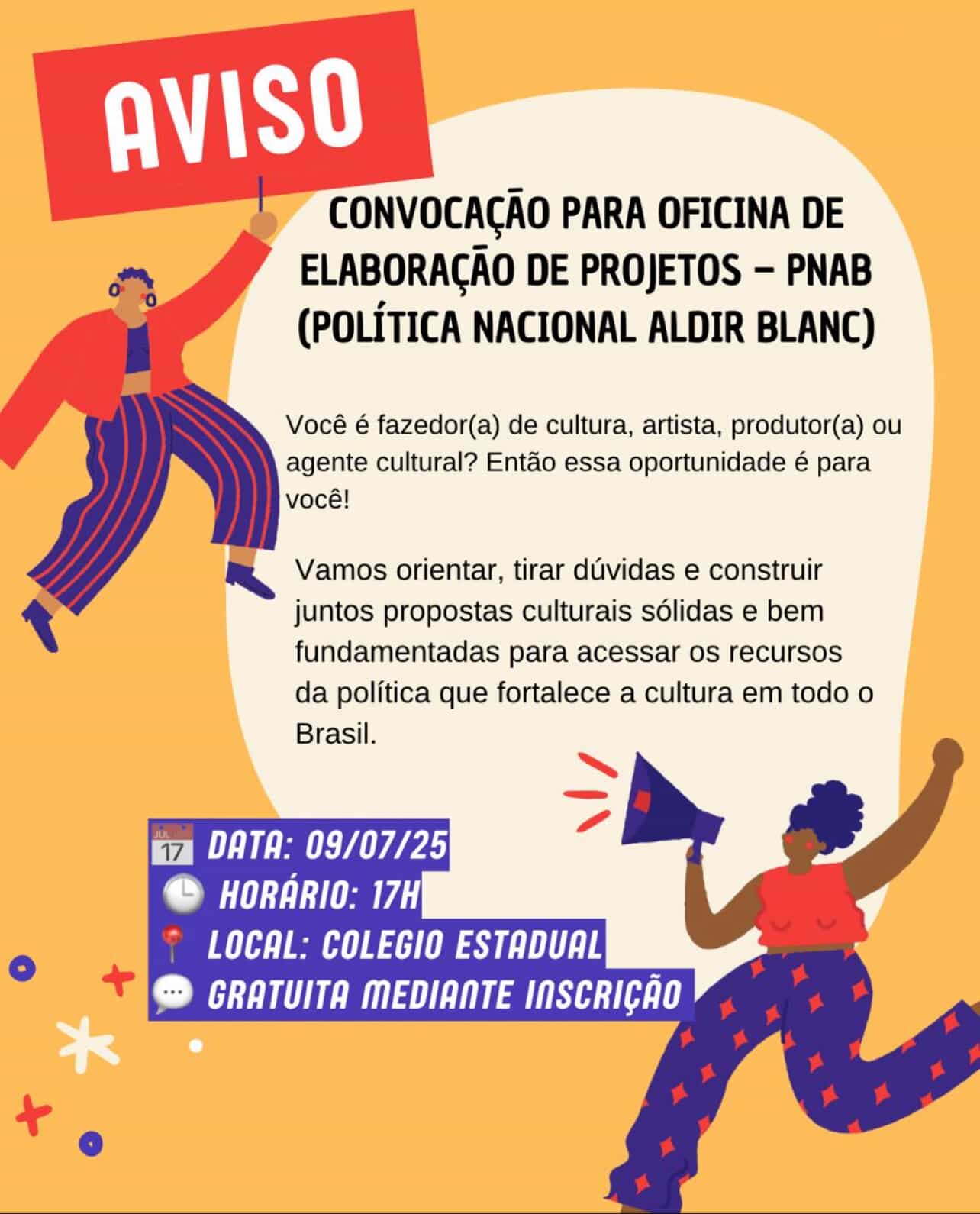 Fazedores de cultura, artistas, produtores e agentes culturais já têm compromisso marcado para o próximo dia 9 de julho, às 17h, no Colégio Estadual. A data marca a realização de uma oficina voltada à elaboração de projetos culturais, com foco na PNAB – Política Nacional Aldir Blanc.