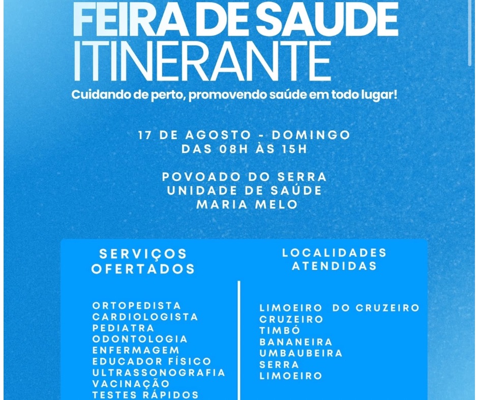 A Prefeitura Municipal de Conceição da Feira promove neste domingo, 17 de agosto, mais uma edição da Feira de Saúde Itinerante – Cuidando de Perto, Promovendo Saúde em Todo Lugar. A ação acontecerá das 08h às 15h, na Unidade de Saúde Maria Melo, no Povoado do Serra.
