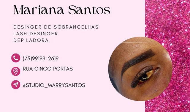 Com talento, dedicação e atenção aos detalhes, Mariana Santos vem se destacando no ramo da beleza em Conceição da Feira. Especialista em design de sobrancelhas, lash design e depilação, Mariana oferece um atendimento personalizado para valorizar a beleza natural de cada cliente.